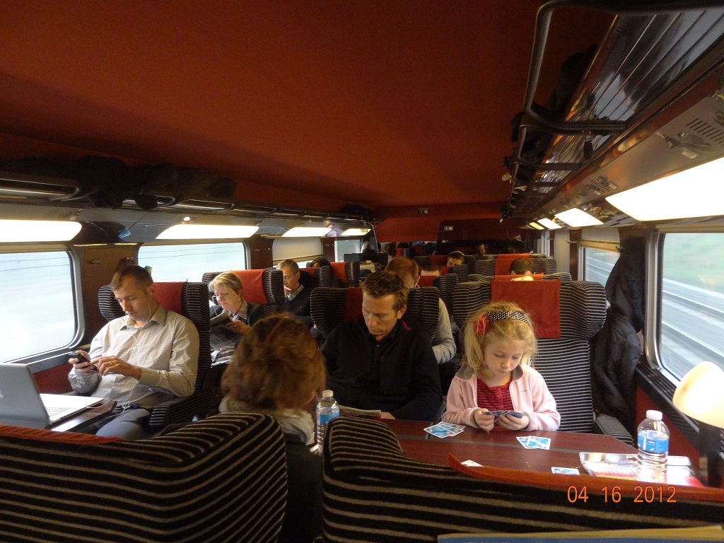 Our train tickets list the departing and arriving cities, the train number, what coach number we are on, and if we are going 1st class or coach. Most Eurail Pass passengers travel via 1st class. In addition to the Eurail Pass you have to buy a reservation on some/most TGV trains. We did on this popular route. The reservation costs an additional $11 for each person for most segments.